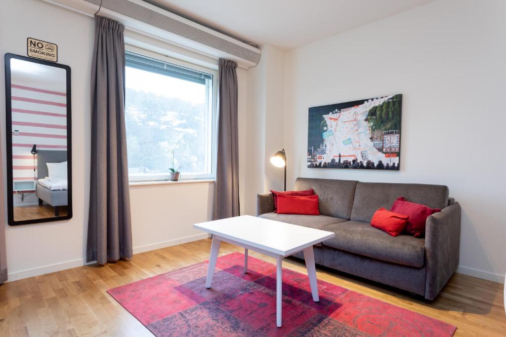 Really nice apartment (if one is booking at least the SUPERIOR STUDIO) as you have a quiet view to the neighbourhood - and you can open a window !!! Nevertheless, the apartment was clean and spacious and the kitchen equipped with all necessary amenities. In general, it looks like a social housing project - hello IKEA without anything luxery - though all is functioning perfectly - only thing it might need a refeshment in furniture soon (leaking water from the shower, little over-used items here and there....) Connection to Stockholm city centre is very easy with Tram and Tunnelbannen or even ferry... very scenic. And if your feet alows you can walk beautifully along the water into the city. We enjoyed our stay a lot The one and only serious problem we faced during our 8 nights stay was a 2 nights neighbour of an unpolite school class who made party late night and even tried to threaten us as we had send a complaint to the managment. Very annoying and non-exeptable. The management moved us to another room for security reasons at the end. This did not change our mood at all though we didn't receive any complementary treatment after