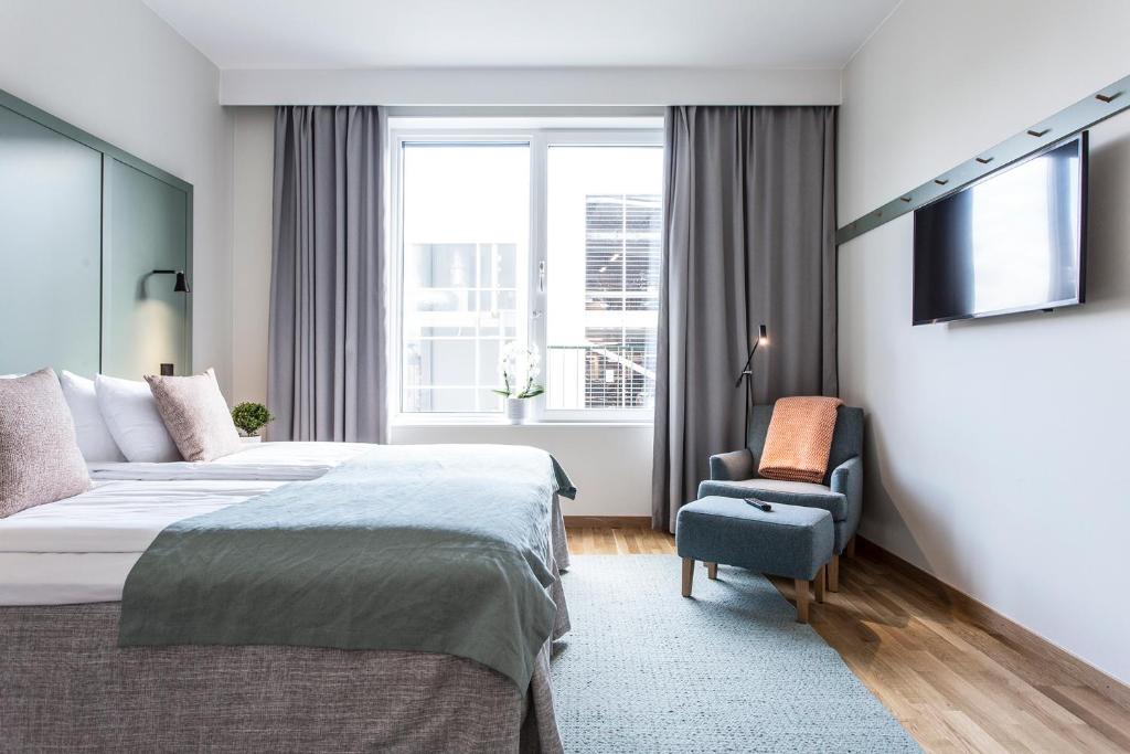 The suite was large enough with a couch, dining table, stovetops, microwave, fridge, kitchen utensil, TV and a spacious bathroom. Perfectly cleaned and comfy beds. The staff were friendly and helped with checkout and even printing some papers that I needed. There’s possibility to use a working space/conference room for a reasonable fee. There is also a laundry room on site. A breakfast buffé instead of breakfast bags could have elevated the experience. The wifi was fine for most part but I had some minor connection issues.
