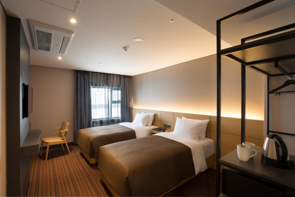 방은 꽤 기본적이었고, 시작부터 카펫이 되어 있어 약간의 먼지가 있었지만 3성급 호텔에서는 예상치 못할 일이 아니었습니다. 위치는 편리했지만 로비는 4층에 위치해 있으며 (아래층은 PC방과 스타벅스와 공유됩니다). 바로 앞에 택시 승차/하차 장소가 있고, 1층에는 CU 편의점이 있어 편리했습니다. 객실은 크기가 괜찮았고, 샤워 압력이 강하며, 난방이 되는 변기 시트(자동 비데 포함)가 있었습니다. 청결 상태는 대체로 괜찮았지만 메인 조명이 없어 방이 예상보다 어두운 느낌이 들었습니다. 직원들은 친절하고 도움이 되었으며, 개인 리무진 예약을 제안하고 추천사항을 제공했으며, 요청 시 여행 어댑터도 제공했습니다. 전반적으로, 객실 당 1박에 미국 달러 *** 이하로 예약할 수 있다면 꽤 괜찮고 실용적인 숙소입니다. 충분히 편안하고 화려함은 없지만, 가격대에 맞는 기대치(그리고 약간 더 나은)에는 딱 맞습니다.