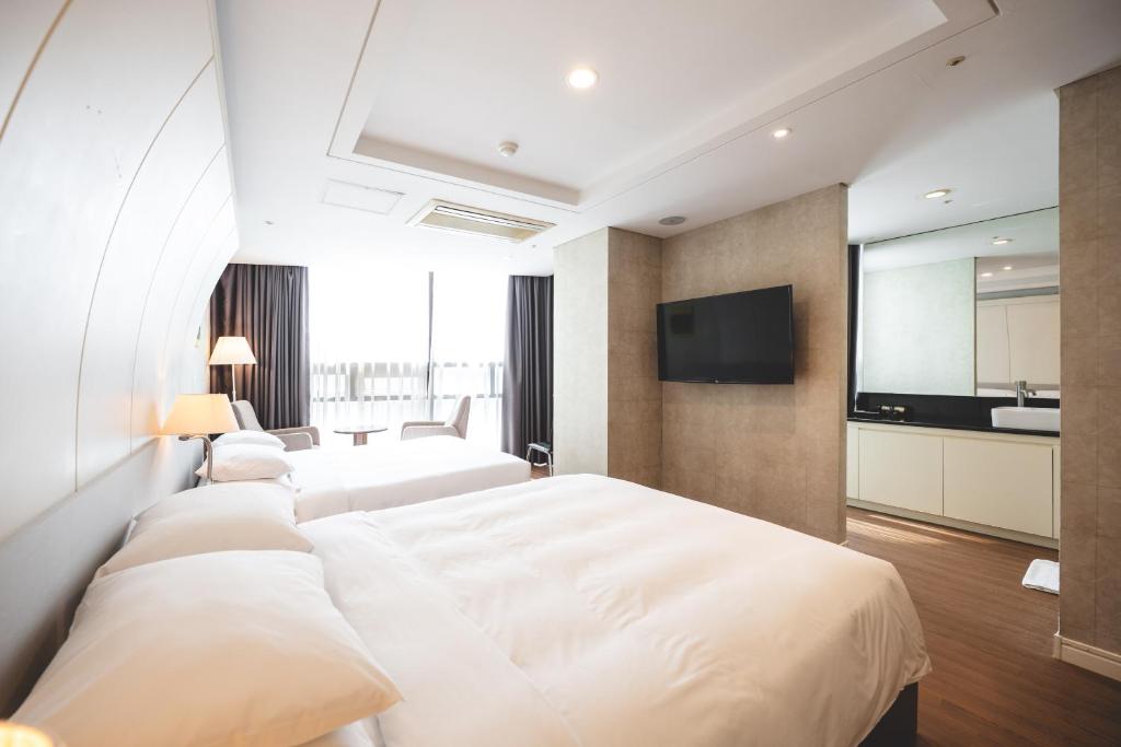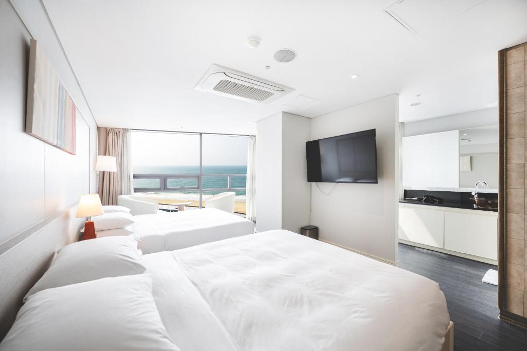 제 아내와 강아지는 아름다운 해운대 해변을 내려다보는 이그제큐티브 스위트에 머물렀습니다. 우리는 발코니, 두 개의 세면대, 그리고 풀사이즈 소파가 있는 넓은 스위트를 즐겼습니다. 그러나 향후 손님들에게 경고하고 싶은 점은 침대가 꽤 단단하다는 것이며, 이는 허리와 목에 문제가 있는 분들에게 불편할 수 있습니다. 또한, 이 호텔은 해운대 해변의 주요 거리 바로 옆에 위치해 있어, 건너편 클럽의 소음이 자정이 지나서도 들리고 교통 소음도 함께 있습니다. 다행히도 호텔에서는 소음을 줄이는 데 도움이 되는 3M 귀마개를 제공합니다. 강아지를 데리고 오는 손님들을 위해 호텔에서 도보로 5분 거리에 개놀이터가 있어 우리에게는 매우 편리했습니다. 저는 특히 강아지와 함께 여행하신다면 이 호텔을 추천합니다. 강아지가 머무는 비용은 3박에 90,000원입니다.